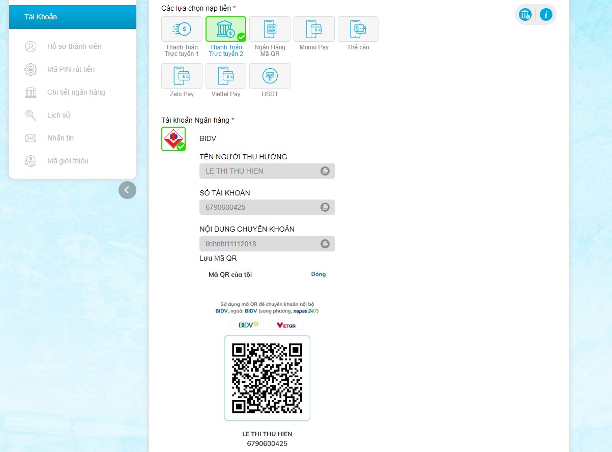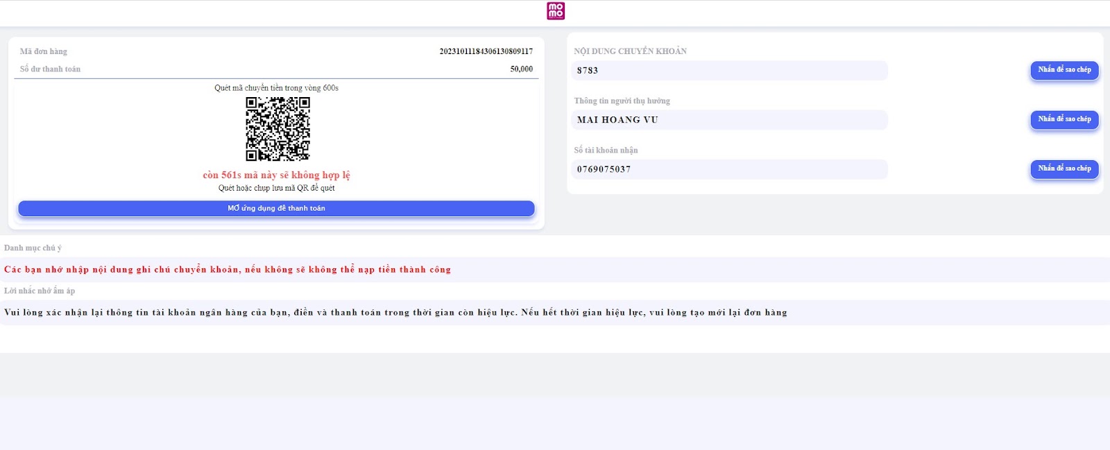 - Bước 6: Sau khi lựa chọn ngân hàng, một cửa sổ mới sẽ hiện ra với mã QR và nội dung thanh toán. Mã thanh toán này sẽ có hiệu lực trong vòng 10 phút. Người chơi có thể copy từng nội dung để chuyển khoản hoặc copy ngay mã QR cho tiện lợi.