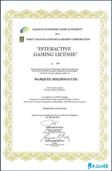 Giấy phép kinh doanh của Jun88 được cấp vào 24/07/2013 bởi First Cagayan Leisure & Resort Corporation (CEZA) – đơn vị bài bạc được ủy quyền từ chính phủ Philippines.