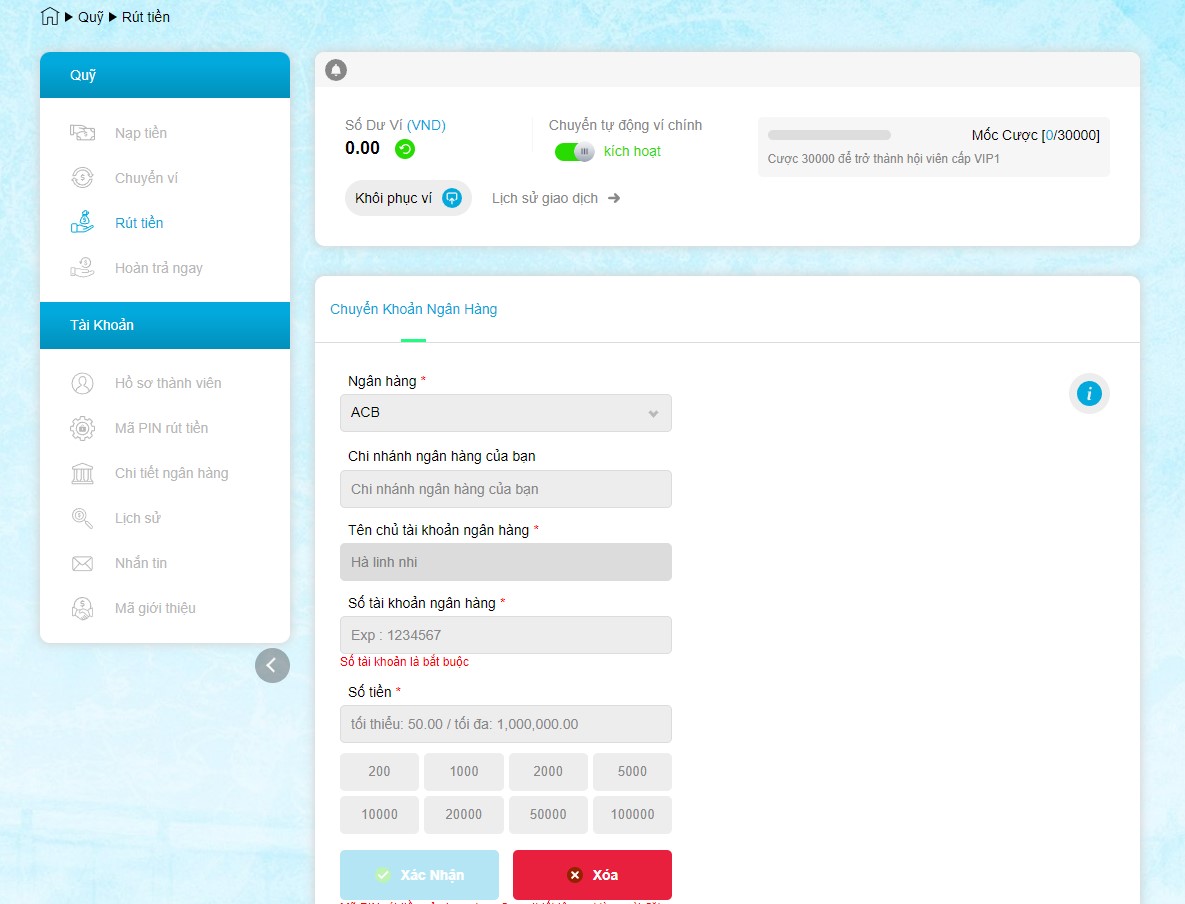 Sau khi thực hiện chuyển ví phụ về ví chính thành công, người chơi có thể trực tiếp rút tiền về tài khoản ngân hàng cá nhân của mình ngay lập tức. Lúc này bạn chọn mục “Rút tiền” và đợi cửa sổ mới hiện ra. Trong đó sẽ có các thông tin giao dịch cần điền bao gồm Tên ngân hàng, chi nhánh ngân hàng, số tài khoản, số tiền và nhấn nút “Xác nhận”.